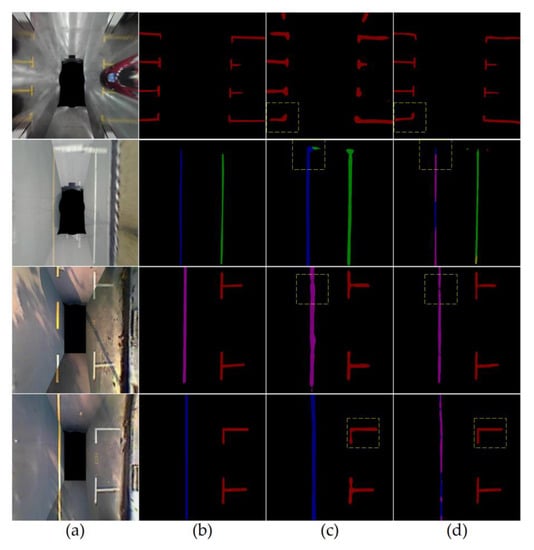 Figure 5 shows the inference results comparison of the PSV dataset after the above network training. Columns (a) and (b) are input images and ground truth in the PSV dataset, respectively. The following columns are the contrast networks, including FCN8 [28], U-Net [29], ENet [36], DeeplabV3+ [33], and PSPNet [30], and the last column shows the results of this work. The colors are labeled according to the six classification orders in the PSV dataset. The sequence is black, maroon, green, light brown, navy blue, and purple. Except for the background classification, the inferred image of RPSD is the only one without misclassification, compared to the ground truth. The upper layer of the RPSD network effectively guides the final segmentation result by coarse segmentation of the resized image so that the network avoids misjudgments. Even for small-scale classifications, the application of adaptive weighted loss enables the Yellow Solid classification signed in navy blue to be effectively identified. Combined with the improvement in edge recognition by the CAM, the inference images of the RPSD network are also closer to the ground truth. As can be seen from the figure, the RPSD network’s output is the closest to the ground truth, with correct classification and a precise edge which achieves the best accuracy and mIoU.