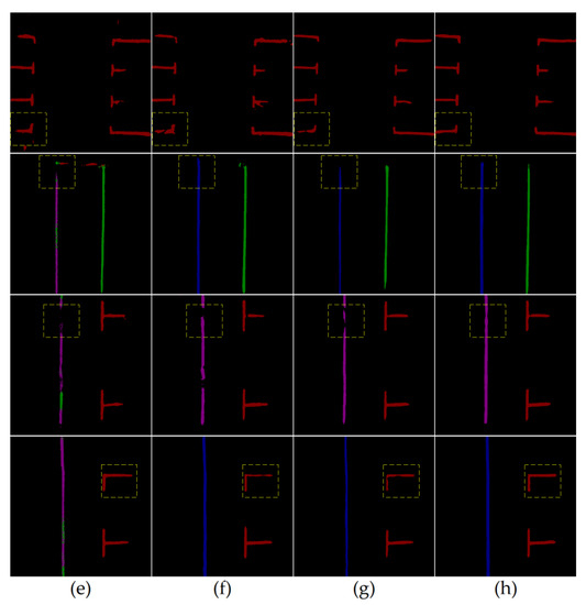 The final segmentation results of multiple algorithms. In the figure, (a) and (b) are the input image and ground truth in the PSV dataset, respectively, followed by inference images of FCN8 (c), U-Net (d), ENet (e), DeeplabV3+ (f), PSPNet (g), and our result (h) in the last column. In order to more clearly show the inference ability of each network for the PSV dataset and facilitate the observation for readers, we have marked the parts in the inference image that significantly differ from the ground truth with a yellow dotted box. The figure shows that the network’s accuracy in the front part is relatively low, and there is a mislabeling problem. The network in this paper has the highest accuracy and mIoU which is closest to the ground truth.