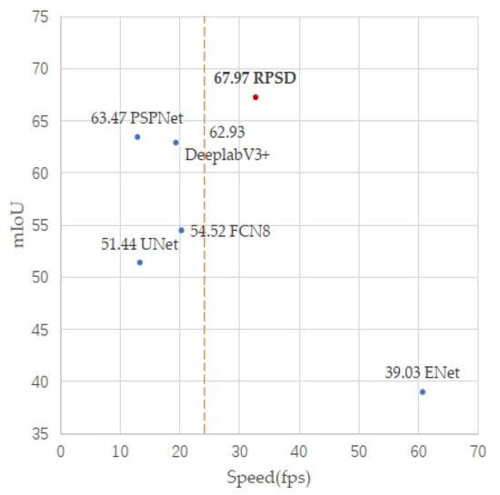 The performance of each network’s Speed and mIoU. The x-axis is Speed, the y-axis is mIoU, and the red dotted line is the real-time dividing line (when the network inferred frame rate is 24). The red dot in the image is the output result of our network. The network has reached the highest mIoU for the PSV dataset and has real-time performance with an inferred frame rate of 32 frames.