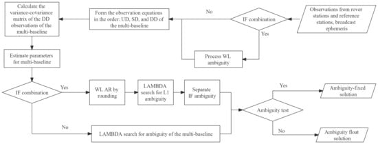 Figure 2 depicts the flow chart of the MBS model. A three-step method was used to solve the IF combined AR problem []. Firstly, the wide-lane (WL) ambiguity was fixed by rounding, and multi-epoch smoothing was performed using HATCH filtering []. Next, the float solution of the IF ambiguity was solved by KF. Then, the L1 ambiguity float solution was extracted from the IF ambiguity using the WL ambiguity, and the Ll ambiguity fixing solution was searched using the well-known LAMBDA method. Finally, the IF ambiguity-fixed solution was obtained.