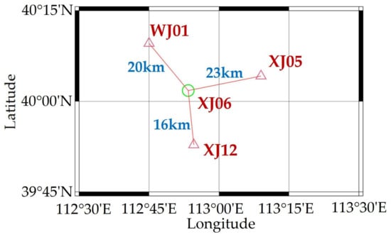 To compare the positioning performance of the MBS model and SBS model, an ideal monitoring environment was firstly considered. Four relatively stable stations with similar heights were selected. Figure 3 shows the distribution map. The dataset contained dual-frequency GPS observations of 60 days (from 15 February 2020 to 14 April 2020), with a sampling interval of 1 min and a cut-off elevation angle of . Three independent baselines were formed, using XJ06 as the rover station and XJ12, WJ01, and XJ05 as the reference stations. The approximate lengths were 16, 20, and 23 km, respectively.