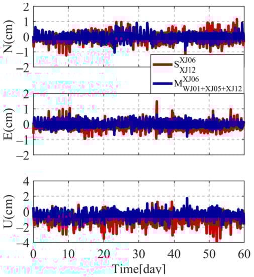 Seven data processing strategies with different reference stations were designed and are listed in Table 1. Strategies , and used the SBS model, with the reference stations being XJ12, WJ01 and XJ05 respectively. Strategies , and adopted the MBS model with double reference stations (namely, WJ01 + XJ12, WJ01 + XJ05, and XJ05 + XJ12). Strategy adopted the MBS model using triple reference stations. It was used to check whether simply increasing the number of reference stations could have a positive impact on the positioning. GPS L1/L2 IF combination was used to eliminate ionospheric effect, and the empirical tropospheric model Saastamoinen was used to reduce the effect of tropospheric delay error. The length of static solution was 2 h. Daily static solutions were determined using software Bernese 5.0 as the true values.