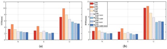 Figure 5 shows the baseline positioning errors of and .Figure 6 shows the STD and root-mean-square (RMS) values of the positioning errors for the seven processing strategies in the north (N), east (E), and up (U) components. The corresponding statistics are listed in Table 2, where the improvement rate of the MBS strategy was calculated compared to the SBS strategy with the shortest baseline length. From Figure 5, it can be seen that the positioning error fluctuation of strategy was significantly smaller than that of SBS strategy , which fluctuated in the N/E/U direction within about 1/1/2 cm, and the rest of the strategies had similar results. The experimental results showed that the positioning accuracy of the MBS model was higher than that of the SBS model. The average improvement of coordinate STD values of the MBS model was approximately 25.7, 19.0, and 21.5% in the N, E, and U components, respectively, with the maximum improvement of about 31.0%. The average improvement of the RMS values was about 22.8, 24.2, and 40.0% in the N, E, and U components, respectively, with a maximum improvement of about 44.8%.