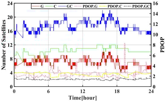 Three monitoring stations (YEY2, YEY3, YEY5) equipped with single-frequency receivers in the ground settlement project were selected to analyze the positioning performance of the proposed MBS model in monitoring baselines with large height differences. Six independent baselines with different height differences were formed with two reference stations (MDT1, NS01). From the rover to reference stations, the baseline lengths were about 15 km and the height differences were about 200 m. Figure 7 shows the distribution map of the stations. The datasets were collected continuously for 60 days, from 15 February 2020 to 14 April 2020, with a sampling interval of 30 s and a satellite cut-off elevation angle of . Figure 8 shows the number of visible satellites and PDOPs of station YEY2 on 15 February 2020. In this contribution, G and C stand for GPS and BDS respectively, PDOP.G and PDOP.C are PDOPs for GPS and BDS. It can be seen that the average number of visible satellites for the combined GPS/BDS reached 17, while the number of GPS satellites was only about 7. The PDOP values for GPS/BDS were significantly smaller than those of GPS-only and BDS-only solutions, indicating that combining GPS/BDS observations enhances the satellite visibility.