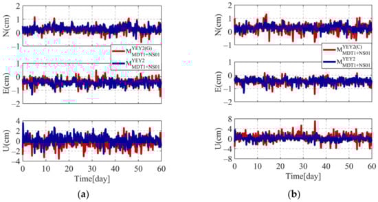 The positioning errors of solutions using different satellite systems including GPS-only (a) and BDS-only (b) at station YEY2.