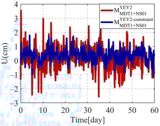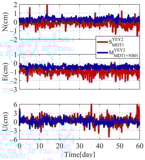 Figure 9 presents the positioning errors of YEY2 in N, E, and U components of SBS processing strategies , and , and the corresponding statistics are listed in Table 4. The experimental results showed that the positioning accuracy of the combined GPS/BDS solutions was superior to those of GPS-only and BDS-only solutions. Compared with the GPS-only solution, the improvement rates of the STD values of the combined GPS/BDS were approximately 23.1, 24.0, and 18.4% in the N, E, and U components, respectively, and the improvement of the RMS values in the U component was more significant than the horizontal components. Compared with the BDS-only solution, the improvement rates of the STD values of the combined GPS/BDS were about 33.3, 13.6, and 41.6% in the N, E, and U components, respectively, and the improvement rates of the RMS values were about 14.6, 7.7, and 43.8% in the N, E, and U components, respectively.