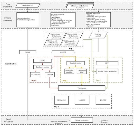 In addition, the combination of backscatter coefficient and GRVI has proved to be very useful for crop classification results. In addition, compared with the non-farmland mask only using GFSAD, the non-farmland mask added with GDSSM can more finely identify small-scale buildings and roads. This study shows that the use of rich polarization information and multi-temporal SAR images brings new possibilities to crop classification and also provides a new idea for the sample size limitation of neural networks in SAR image applications.