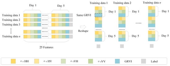 A RadarSat-2 image has four polarizations. Five features can be obtained from each SAR image. They are four backscattering coefficients (σ0 HH, σ0 HV, σ0VH and σ0 VV) and a generalized volume scattering model based on radar vegetation index. Since five RadarSat-2 images at different times are used, the characteristic shape of each sample is (1, 25). To facilitate the input of samples into the 1D-CNN model, the GRVI values of five dates are copied, filled into the features and reshaped. The shape of each sample changes to (15, 2), as shown in Figure 3.