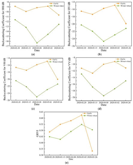 Temporal profiles of the two different crop types with respect to the backscatter coefficient: (a) HH (b) HV (c) VH and (d) VV; (e) temporal profiles of the two different crop types with respect to GRVI.