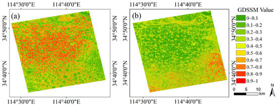 GDSSM value images of study area for (a) winter wheat sample and (b) garlic sample.