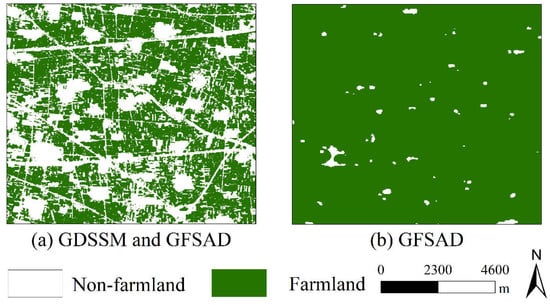 Analysis of the farmland mask for (a) GDSSM and GFSAD and (b) GFSAD.