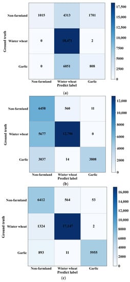 By analyzing the confusion matrix, it can be found that the user’s accuracy for non-farmland area is very low in the results using the GDSSM method. The reason is that when only the threshold method is used for classification, the classification performance is affected by the selection of threshold, the proportion of mixed pixels, and image noise, which is also reflected in other classification results of the GDSSM model. In the results using the 1D-CNN method, the user’s accuracy and producer’s accuracy for garlic are very low. The reason for this result is that the sample size is too small, which makes the model unable to fully learn the types of crops in the training stage. The GDSSM-CNN model has very high user accuracy and producer accuracy, which proves that this model also has very good performance when there is a limited number of samples.