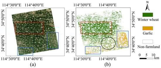 The field survey data are essential information for crop classification and accuracy verification. In order to ensure the authenticity and accuracy of the ground field survey data, field surveys were conducted at the time of each satellite transit from July 2019 to June 2020 to collect and record the sample data of crops in the study area. During the field survey, Jisibao UG905 GPS (positioning accuracy is 1 to 3 m) was used outdoors to record the longitude and latitude information of the sampling point, and photos were taken to record the crop category information of the sampling point. Finally, 10 winter wheat sampling sites and 5 garlic sampling sites were randomly selected as samples. Two areas in the study area were selected randomly as the verification area through Google Earth software, and the types of crops in the verification area were determined through ground field investigation. The validation area contains 32,361 pixels in total, including 18,473 pixels for winter wheat, 6859 pixels for garlic and 7029 pixels for non-farmland areas. The distribution of the verification area and sampling points are shown in Figure 1a.