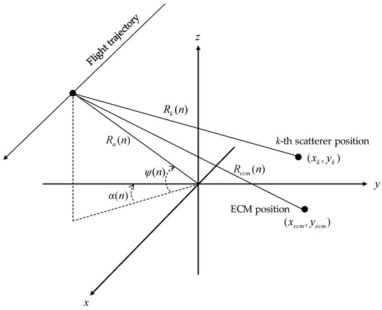 In this section, we derive the models and describe the methods used to generate the raw data of the proposed spotlight SAR simulator. The raw data include both the reflected echo signal and jamming signal from the ECM (i.e., jammer). The geometry of the airborne spotlight SAR for the simulator is shown in Figure 1.