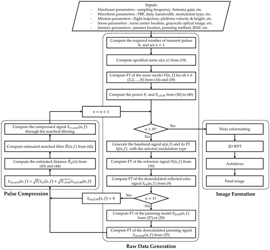 In this section, detailed descriptions of the structure and methodology of the proposed airborne spotlight SAR simulator are presented with the simulation results. The flowchart of the simulator is shown in Figure 2.