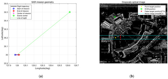 Graphical representations of the inputs for the proposed airborne SAR simulator. (a) SAR mission geometry, including flight trajectory, flight direction, and scene center. (b) Grayscale optical image used to generate the reflectivity map, and the positions of the point target, ECM, false targets, and the area of false image due to jamming signal.