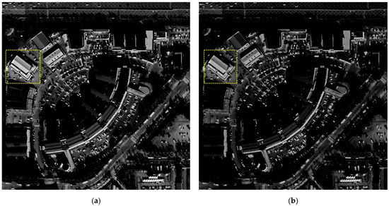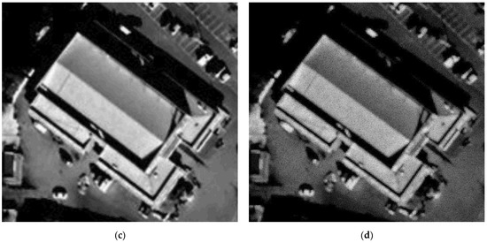 The raw data generation process starts with the initialization stage. In this process, the required number of transmit pulses is firstly computed from PRF and SAT. Then, the speckled scene is computed from Equation (19). The scenes with and without speckles are shown in Figure 4a,b, respectively. The effect of the speckle application can be confirmed by the images in Figure 4c,d, which are the enlarged images of the yellow boxes in Figure 4a,b, respectively. With the speckled image in Figure 4b, the FT of the scene model is computed from Equations (14) and (18). Since the number of azimuth pixels in will be different with respect to the required number of pulses, they should be matched by zero-padding or appropriate filtering when computing Equation (18). The number of samples in a pulse should also be matched by the same process. After is computed, the power of the received reflected echo and jamming signal is computed from Equations (30) to (40), which is the last procedure of the initialization stage.