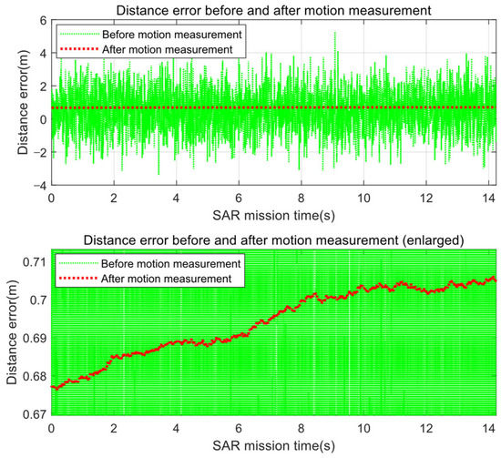 Errors of the distance from the SAR antenna to the scene center before/after the motion measurement, i.e., the velocity integration. The lower figure is an enlarged view of the upper figure.