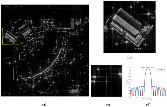 The image formation results without the motion measurement errors and jamming signal. (a) Full size image. (b) Enlarged image of the yellow box. (c) Enlarged image of the green box near the point target. (d) IRF of the point target.