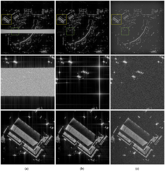 The image formation results with the jamming signals. The images in the first row show the full-size images. The images in the second and third row represents the enlarged images of the yellow and green boxes in the images of the first row, respectively. The images in (a,b) show the jamming results of the NCJ and FTJ, respectively, and those in (c) show the images with pulse diversity.