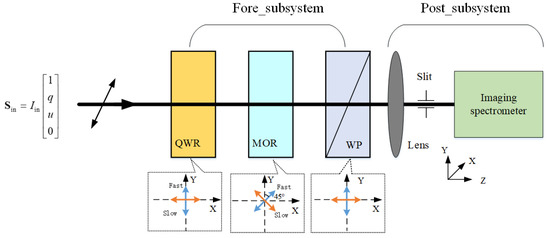 The fore-subsystem is an SMM, including QWR, MOR, and WP; the post-subsystem consists of a telescope module and imaging spectrum module. A global coordinate system is established with the horizontal polarization direction parallel and perpendicular to the WP as the X and Y axes and the system optical axis direction as the Z axis. Considering the polarization characteristics of the UVISP, when incident light passes through the system, the Stokes vector of emergent light can be described as
