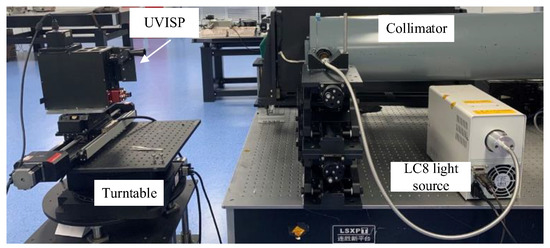 The geometric calibration site is depicted in Figure 3. A collimator, a point light source, and a high-precision three-dimensional adjustment turntable are all part of this system. The point source is a HAMAMATSU LC8 light source with a spectral coverage range of 300 to 800 nm. Parallel light with a 0.02° angular extent is generated by the collimator and received by the UVISP. The angle of normal incidence for the parallel light is defined by the zero FOV of the UVISP, and the scanning angles are changed by rotating the turntable where the instrument is mounted along the slit direction at fixed angular intervals. In this paper, the scanning angle varied in intervals of 0.5° within −4° to +4°.