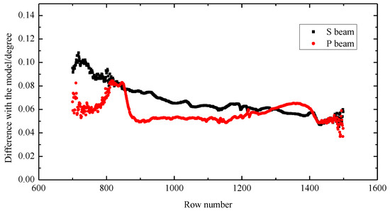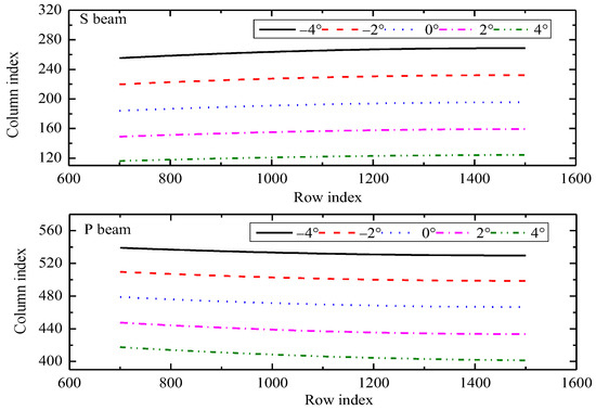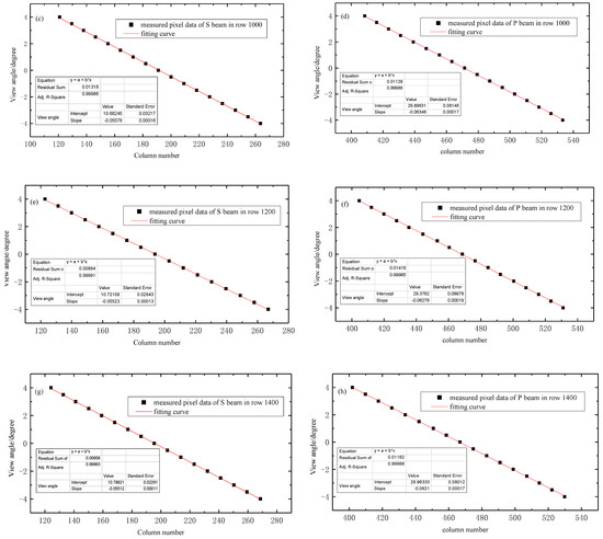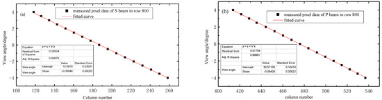 For the pixels in the same row, the linear regression analysis between the pixel column number and the FOV for both the S beam and P beam was completed to assign the view angle to each pixel of the detector. Some of fitting results are shown in Figure 7. We can see that the measurement data points are near the fitting curve with good linearity and the value of are all close to 1. The accuracy of geometric calibration of each row pixels of UVISP can be described by the maximum residual between the model theoretical view angles and the actual view angles. The residuals of fitting results of the S beam and P beam corresponding to different row pixels are shown in Figure 8. It can be seen that the residual values were large in the ultraviolet band (smaller column number), which was mainly due to the greater chromatic distortion suffered in the ultraviolet band compared to the visible band (larger column number), but maximum differences of all row pixels of UVISP were less than 0.12°.