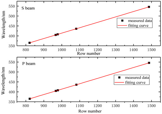 where , denote the wavelength, and is the row index of the detector. The observation bands of the S beam and P beam covered 332.18–549.98 nm and 331.94–549.78 nm, respectively, thus meeting the needs. Then, the wavelengths were assigned to all spectral indices, and this procedure was performed for all FOVs.