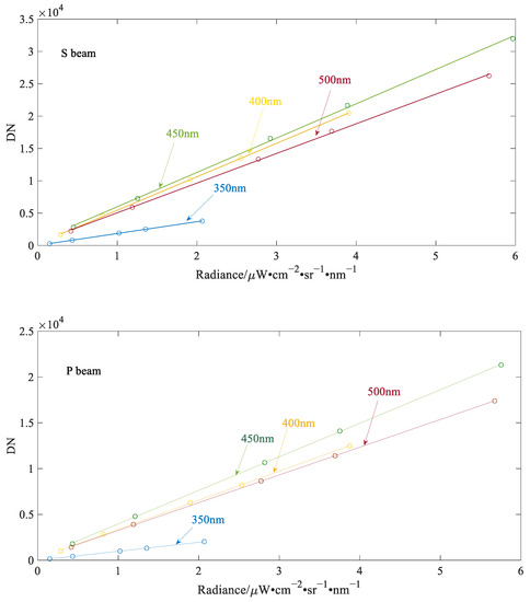 where , denote the radiometric calibration coefficients; , represent the output DN of UVISP at wavelength ; is the incident light spectrum radiance; and , denote the biases of S beam and P beam caused by the calibration source and stray light, respectively.
