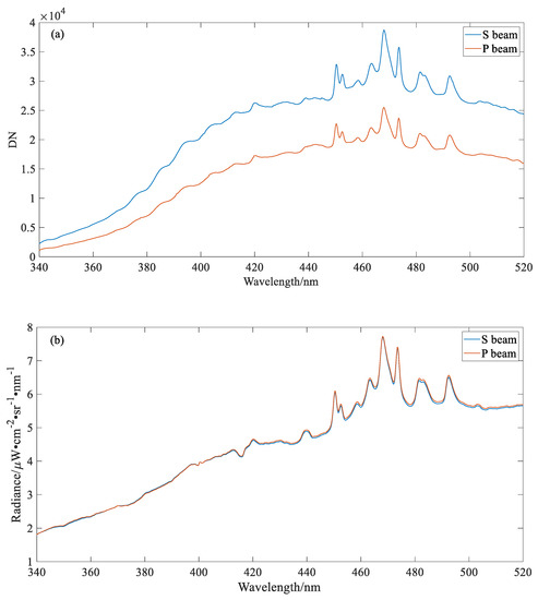 Comparison of the S beam and P beam before and after radiometric calibration: (a) the DN value of the S beam and P beam; (b) the spectral radiance of the S beam and P beam.
