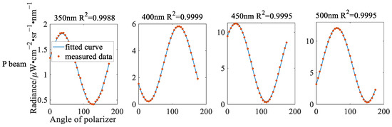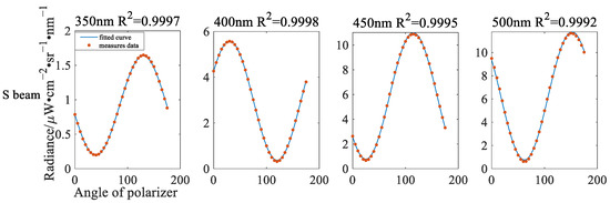 where and represent the AoLP and spectral radiance of incident light, respectively. According to the radiometric model and combined with the radiometric calibration coefficient, the radiances of the S beam and P beam recorded by the UVISP are calculated as