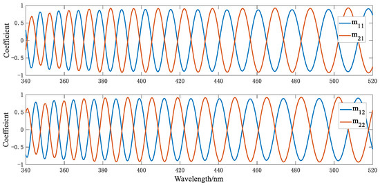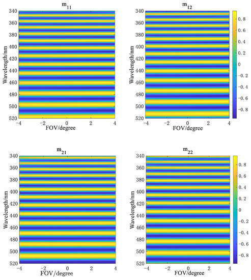 where , , and denote the transmittance, diattenuation, and retardance of the telescope, respectively. Similarly, the mirror groups in the imaging spectrum module are modeled in the same way as the lenses. According to the Müller matrix properties of the mirror interface, the equivalent Müller matrix can be described as [40]