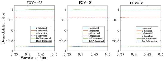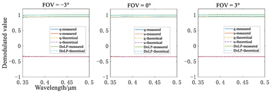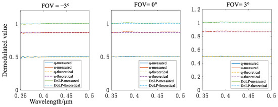 An experiment was conducted to verify the correctness of the demodulation and polarimetric calibration method. The setup was the same as that in Figure 16, consisting of an LC8 integrating sphere and a polarizer. A rotating polarizer could produce linearly polarized light with arbitrary AoLPs. The demodulation process was performed using the following steps: (1) extracting the modulated spectrum of a certain FOV of the S beam and P beam and spectral matching, which are conducted at the same time, (2) using the radiometric calibration coefficients to correct the response differences of the S beam and P beam, and (3) applying the demodulation method presented in Section 2.3 to reconstruct the Stokes parameters.
