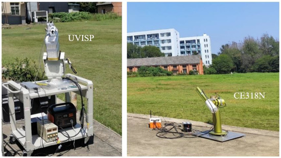 The experiment was performed in Hefei, China, on September 10, 2021, and the weather was clear and cloudless. The CE318N and UVISP were placed close together. Fixing the azimuth angle, both instruments set the same scanning angle step and achieved scanning in the principal plane by changing the zenith angle. The experimental site is shown in Figure 23. For this experiment, we defined the zenith angle of the sun’s position as 0°, and the scanning angle back from the sun was a negative angle. The scanning range of the zenith angle was chosen to be −35° to −90° to avoid blockage by buildings at the experimental site.