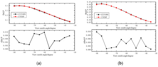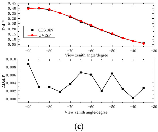 Figure 25 shows the demodulated DoLPs at the central FOV of the UVISP at different scanning zenith angles. The DoLP of atmospheric scattered light varied slowly with wavelength and was proportional to the zenith angle, which is consistent with the theoretical model of atmospheric scattering light, indicating the effectiveness of the instrument measurement data. Figure 26 shows the DoLP comparison results of the two instruments at the same detection band, where represents the absolute deviation. For the three comparison bands, the DoLPs measured by the two instruments at different zenith angles were in good agreement, and the absolute deviations were within 0.01, demonstrating the correctness of the polarization calibration method and the reliability of the measured data.