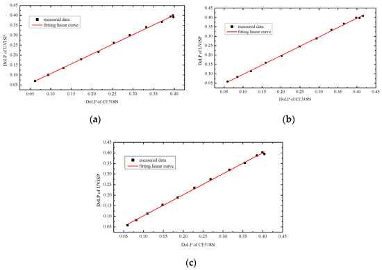 DoLP measured by CE318N and UVISP at spectral bands at 380 nm, 440 nm, and 500 nm, and the fitting result of the three detected bands: (a) 380 nm; (b) 440 nm; (c) 500 nm.