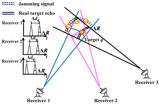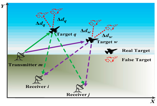 where , and the term of denotes the conjugate transpose operator. To counter radar detection, the self-defense jammer equipped on the real target implements jamming by delaying and retransmitting transmit signals [16]. For the qth target which is illuminated by the mth transmit antenna, the false target can be constructed by introducing the deceptive distance . Hence, the baseband representation of the received signal reflected by the qth target via the path can be expressed as [17]:
