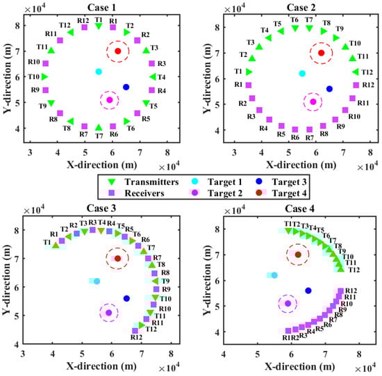 As can be seen from Table 2 that target 3 is assigned as the target to be located in each of the four cases because it has good observation conditions and is not covered by the distance deception signals. In addition, since both target 2 and target 4 transmit distance deceptive jamming signals, one of the targets between target 2 and target 4 in case 1, case 2, and case 3 is defined as a false target, while the other target is assigned to discrimination task. In particular, target 2 and target 4 are defined as false targets in case 4 due to the closer observation distances. As for target 1, since its position is near the center of the radar antennas in case 1 and case 2, better observation conditions are available and the DPs with respect to target 1 are lower. In this case, target 1 is judged to be a true target and the localization task is performed both in case 1 and case 2. Moreover, since target 1 is located far away from the radar antennas in case 3 and case 4, the relevant measurement error increases, resulting in an increase in DP values.