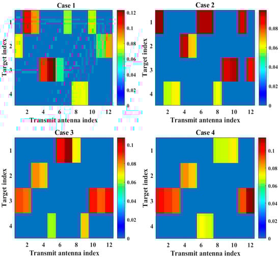 The results of transmit antenna selection and power allocation under four different cases are given in Figure 5. Herein, the color in each rectangle represents the ratio of allocated power , for , and . In particular, the indigo blue color indicates the ratio , which means that the mth transmit antenna is not selected for illuminating the qth target. Meanwhile, the crimson color denotes that the ratio achieves the maximum. In addition, the results of task assignment and DP for each target under four different cases are shown in Table 2.