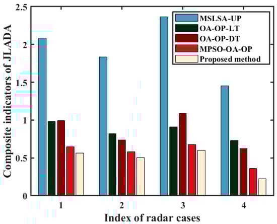 The above four benchmark algorithms are compared with our proposed algorithm in terms of the composite indicator of joint localization accuracy and discrimination ability (JLADA). To be specific, the results of resource allocation by using the four benchmark algorithms are substituted into the model established in this paper, and then the objective function values in (18) are calculated under the constraints of the binary judgments of (19) and (20). The comparative analysis of composite indicators of JLADA based on different resource allocation strategies is demonstrated in Figure 6.
