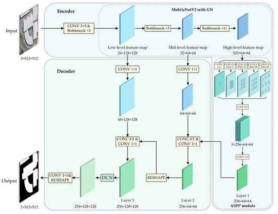 - In the encoding stage of MSL-Net, we introduce the MobileNetV2 [] architecture to extract multilevel features. The inverted residual blocks in MobileNetV2 are constructed as bottlenecks using depthwise separable convolution (DSC) [] and group normalization (GN) operations [], which noticeably reduce the model complexity while improving its training and inference speeds. The multiscale features are extracted by an ASPP module to enhance the ability of the model to recognize multiscale buildings.