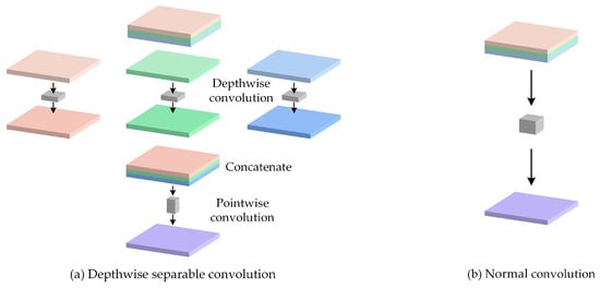 As shown in Figure 2, a DSC consists of two steps, a depthwise convolution and a pointwise convolution, which are performed separately in the spatial and channel dimensions to capture spatial information and fuse cross-channel depth information. Suppose that the input feature map size (length × width × channels) is DF × DF × M, the output feature map size is DF × DF × N, and the normal convolution kernel size is DK × DK × M. Then, the ratio of the number of DSC parameters to the number of normal convolution parameters is: