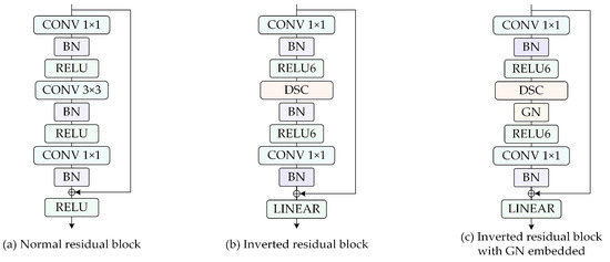 Schematic diagram of (a) the normal residual block, (b) the inverted residual block, and (c) the inverted residual block with GN embedded.