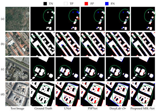 MSL-Net effectively reduces the amount of missed detection and effectually suppresses the occurrence of false detection, as shown in Figure 8a,c. Figure 8b shows how MSL-Net successfully distinguishes rooftops and road surfaces with similar spectral features, weakening the influence of the “interclass spectral homogeneity”. MSL-Net also effectively distinguishes between white and brown rooftops with different spectral features and successfully extracts white buildings shaded by trees, indicating that MSL-Net can reduce the impact of shaded buildings to some extent. We can observe in Figure 8b,d that MSL-Net can recognize buildings with complicated structures.