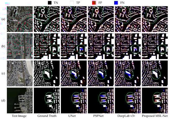 The WHU dataset is the most accurate building dataset available to date []; it consists of aerial images of Christchurch, New Zealand, with extraordinarily high image resolutions. Building images with obvious spectral features, geometric features, and spatial distribution features are selected from the dataset for display, as shown in Figure 7, where white pixels indicate the correctly detected parts of a building, red pixels indicate incorrectly detected parts of a building, blue pixels indicate the missed parts of a building, and black pixels indicate the correctly detected background.