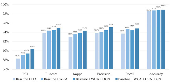 The metrics of the model demonstrate constant trends toward superiority with the adjustment of the LR policy, the addition of the DCN, and the embedding of GN in the inverse residual module. For instance, on the WHU dataset, the WCA increases the IoU by 0.8% and the F1-score by 0.7%, the DCN module increases the IoU by 0.3% and the F1-score by 0.3%, and the improvement of the inverse residual structure increases the IoU by 1.0% and the F1-score by 0.1%. The ablation experimental results strongly prove the effectiveness of our introduced improvements.