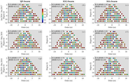 First, we scrutinize these three SHC datasets in the spectral domains over three periods: The end of GRACE (January 2016–June 2017), the gap months between the GRACE and GFO missions (July 2017–May 2018), and the beginning of GFO (June 2018–December 2018). The Swarm solutions (http://icgem.gfz-potsdam.de/series/02_COST-G/Swarm, Potsdam, German, April 2022) for the same period are used as a reference for the calculation of rRMS values Equation (3). The average gravity field measured from GRACE for the period January 2003 to December 2010 is subtracted from the Swarm result. Considering the limited spatial resolution of the QF, only the low-degree terms (degree ≤11,140 coefficients in total) were compared.