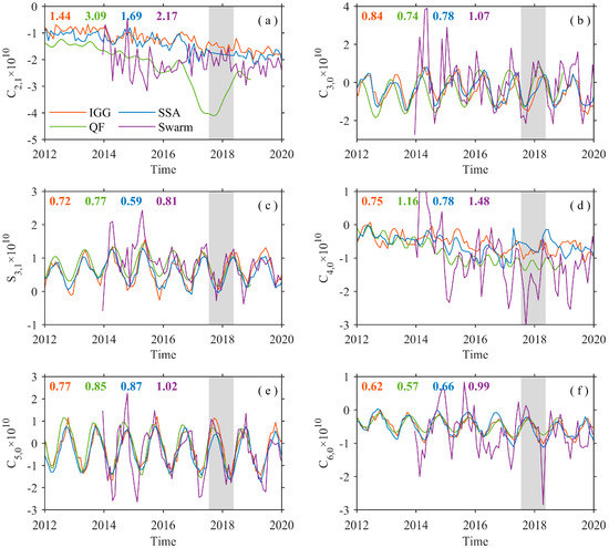 Time series of selected coefficients of the IGG, SSA, QF, and Swarm data: (a) C2,1, (b) C3,0, (c) S3,1, (d) C4,0, (e) C5,0, (f) C6,0. The upper left values are the RMS values for IGG, SSA, QF, and Swarm, respectively.