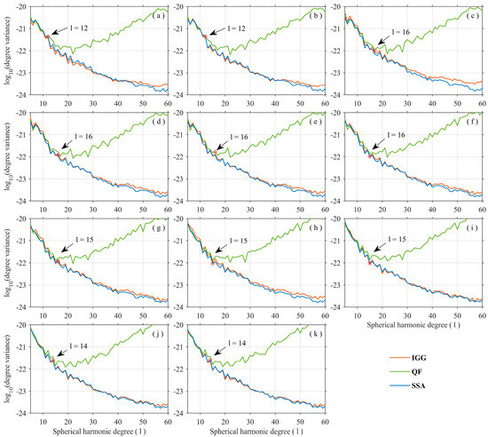 Logarithmic (base 10) variances versus degree of SHCs of the IGG, QF, and SSA data during the 11-month gap (July 2017–May 2018). (a–k) denote the time series from July 2017 to May 2018, respectively.