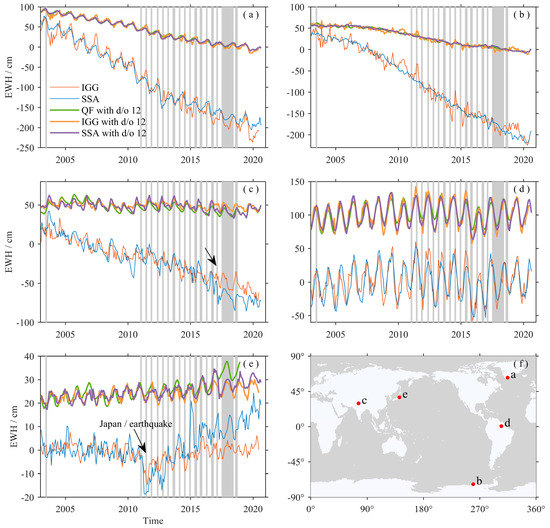 Figure 4 shows that the QF, SSA, and IGG data are in high agreement in reflecting the signal of polar ice melting or strong terrestrial water storage variations. The trends of the EWH time series with d/o up to 12 are lower than the results with d/o up to 60, which should be attributable to the fact that only single points were investigated. Limited by spatial resolution, QF is not suitable for monitoring co-seismic or post-seismic signals. Compared to QF and SSA, IGG seems to have a higher signal amplitude. Furthermore, there existed certain differences between SSA and IGG after August 2016 (Figure 4c,e). A possible reason for this discrepancy is that GRACE data after August 2016 was not used when the IGG recovered the time-varying gravity field from the SLR, and the emerging differences likely arise from the divergent spatial resolution between the two kinds of gravity measurements.